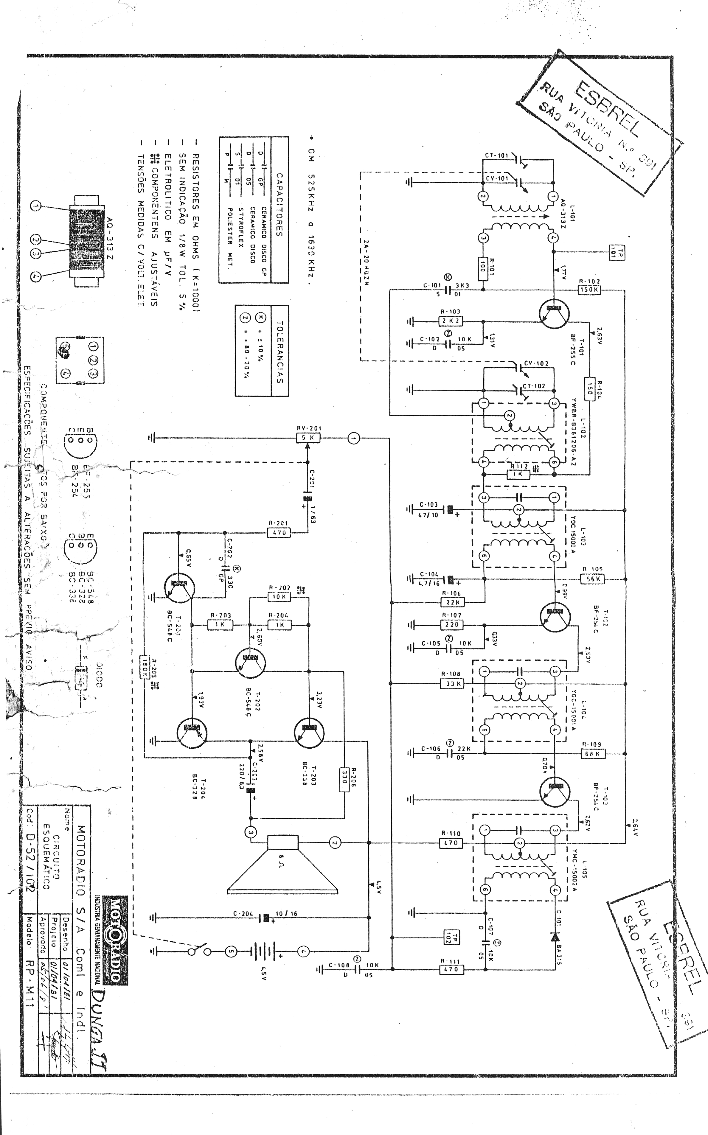 Esquema do rádio portátil à pilha Motorádio, modelo RP-M11, conhecido como "Dunga".
