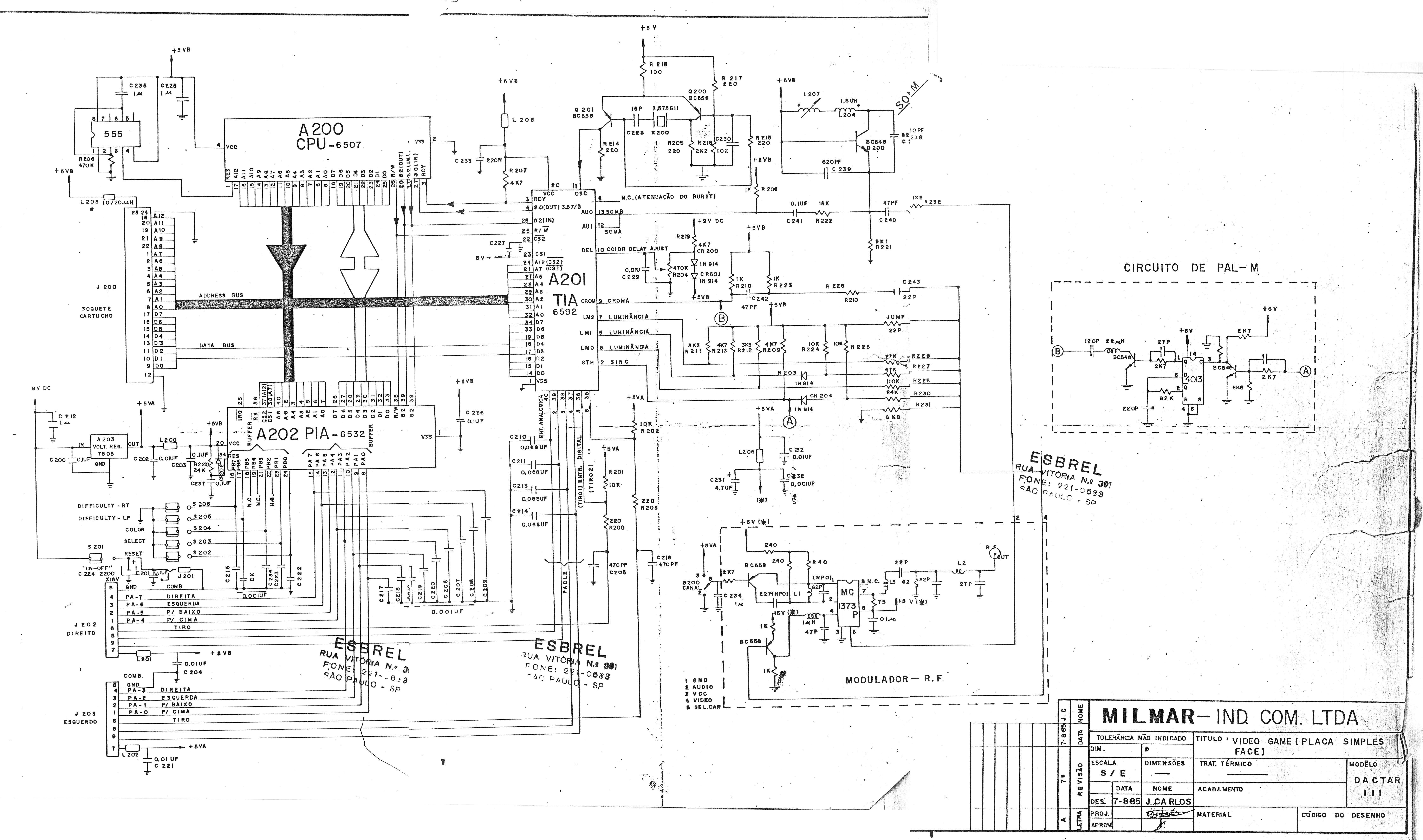 Esquema do video-game Dactar 3 da Milmar, compatível com o Atari. Este esquema está mais completo, inclui o esquema da placa de conversão para PAL-M.